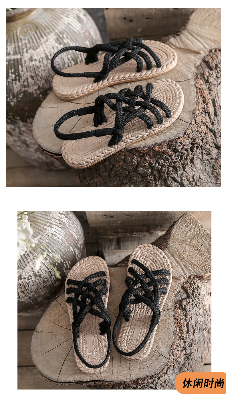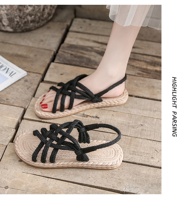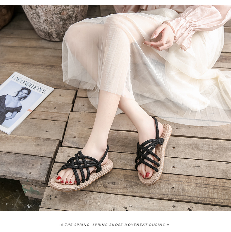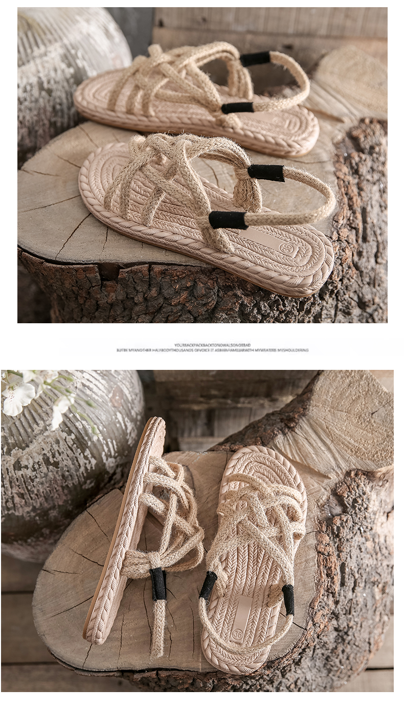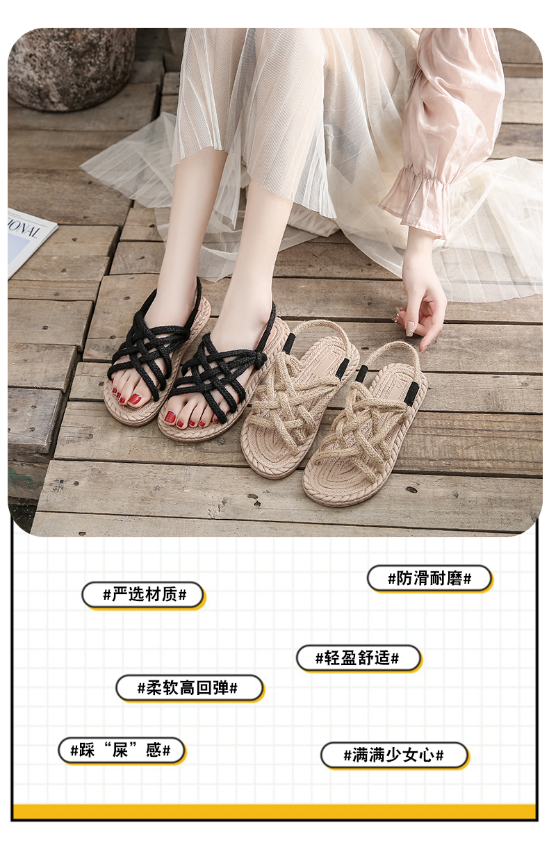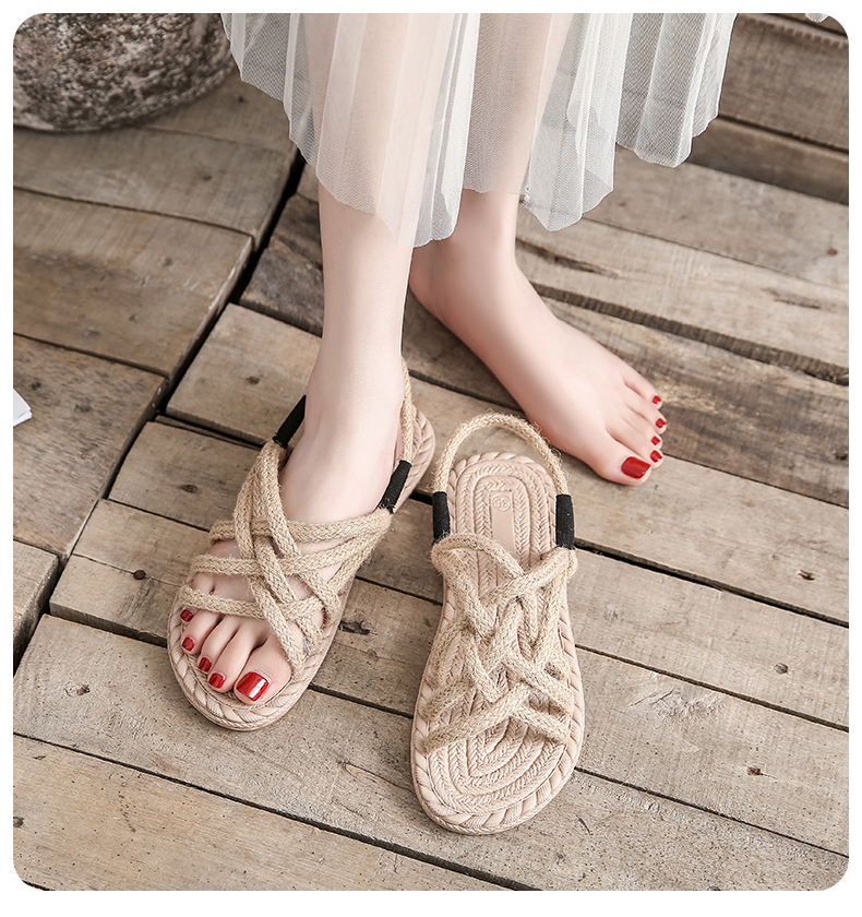 わら麻縄サンダル女子学生夏イン潮平底妖精風ローマ織り